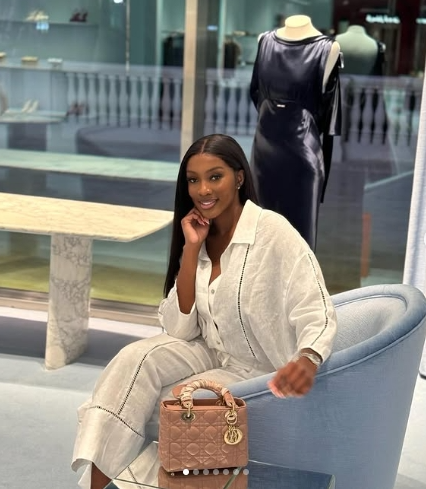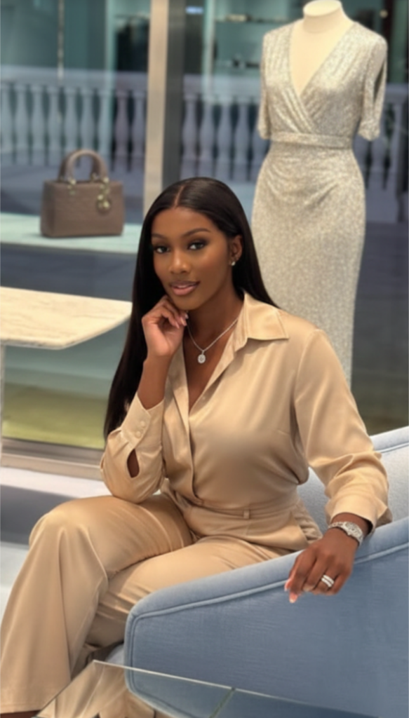 - The Styling: She pairs the bold dress with minimalist forest green ankle-strap sandals, which elongate the leg without competing with the dress’s vibrant pattern. Her hair is styled in voluminous, polished waves that complement the “royalty” aesthetic PISTIS GH is known for.
