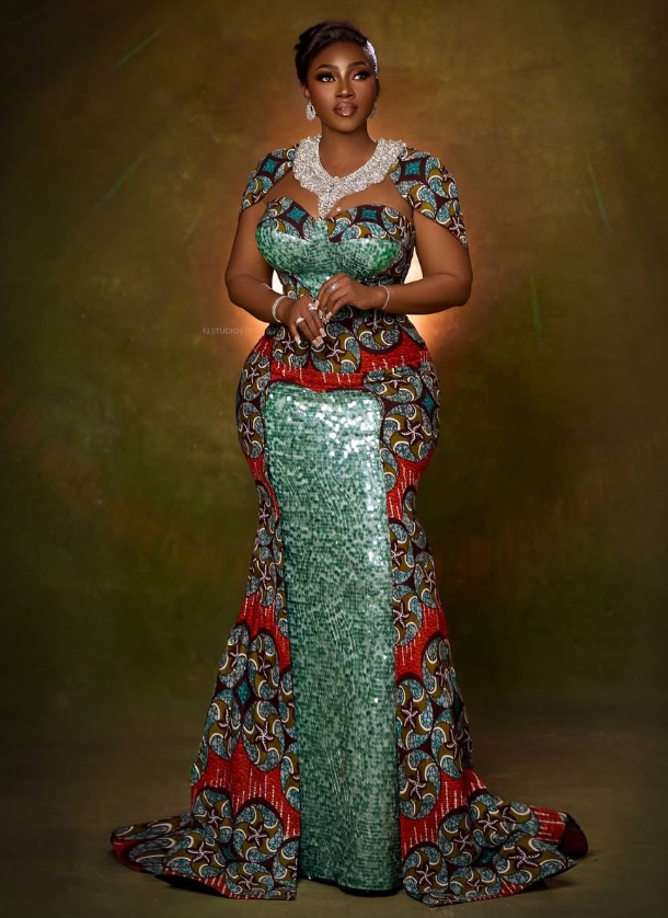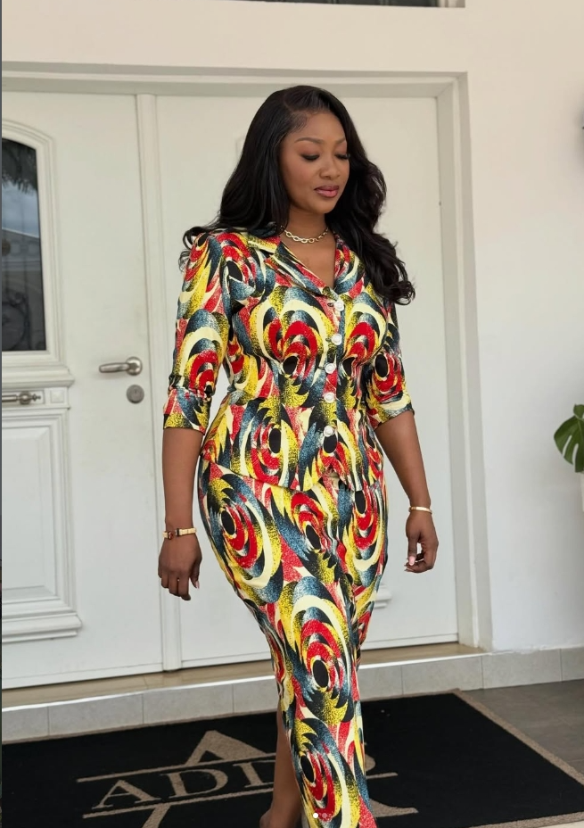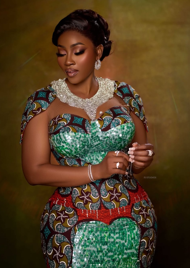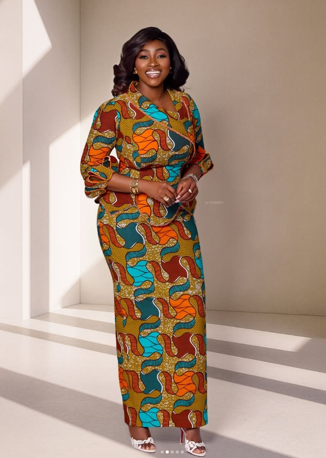 This outfit, worn by Akosua Owusuwaa and designed by Yartelgh (as curated by evic.store), is a masterclass in modern Ghanaian elegance. It beautifully balances the “Osagyefo-IMAGINE” philosophy by blending local creative soul with a global silhouette.