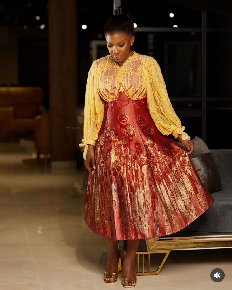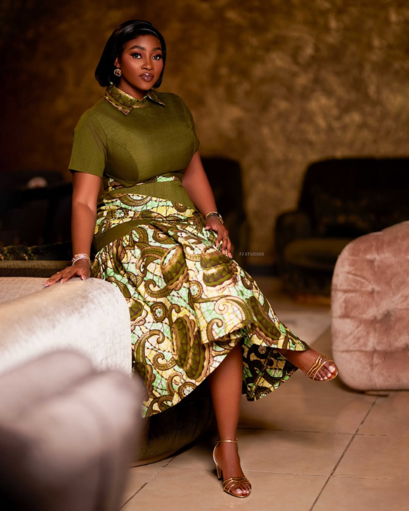 The outfit featured is a stunning, form-fitting olive green midi dress with patterned fabric accents that enhance her silhouette. The puffed sleeves and wrap-style waist detailing exude elegance and sophistication. The look is completed with ready-to-wear pieces blending African chic with contemporary design, crafted by @amatchiwa.