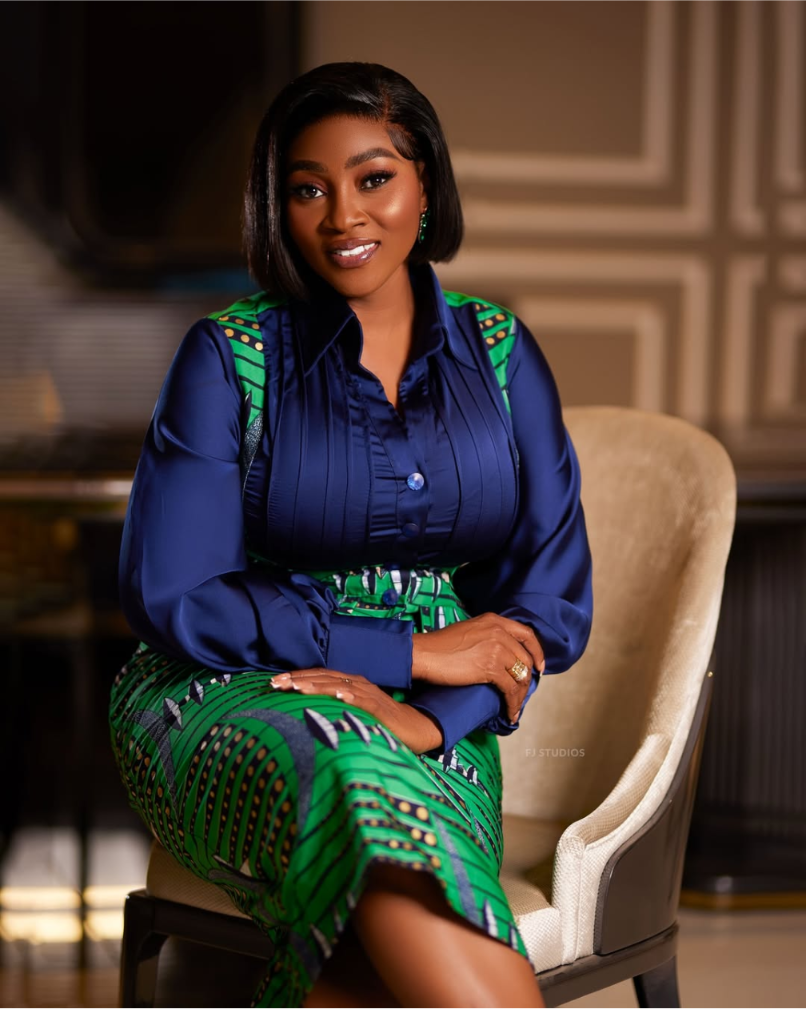 Meet Baaba Ankrah, the visionary CEO of Goba Kente, radiating elegance and strength in a stunning, bespoke Kente ensemble — a proud symbol of Ghanaian heritage.