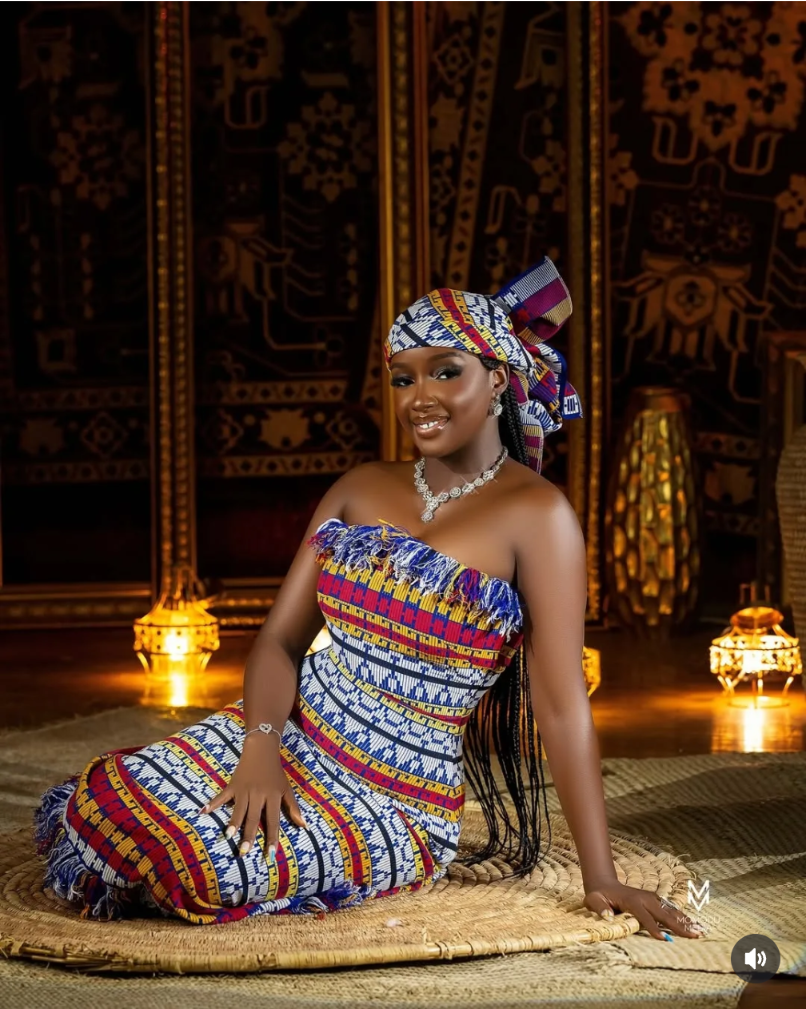 Her outfit is a brilliant fusion of tradition and modern sophistication. The rich earth-toned browns paired with vibrant fuchsia pink patterns reflect both the regal roots and evolving beauty of Kente. The top is finely tailored with classic motifs, while the lower section blends contemporary lacework with traditional weaving — a perfect metaphor for the seamless blend of history and innovation.