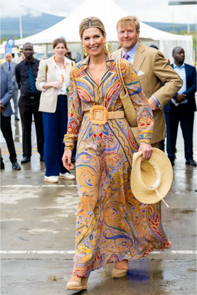 Draped in a mesmerising ensemble, Queen Máxima embodies Dutch elegance. Her outfit celebrates the national House of Orange through its striking orange tones. The intricate paisley and baroque patterns, woven with gold, red, and blue, add a regal touch, while the flowing silhouette and statement belt exude confidence and sophistication. This look is more than fashion—it is a tribute to Dutch heritage and royal distinction.