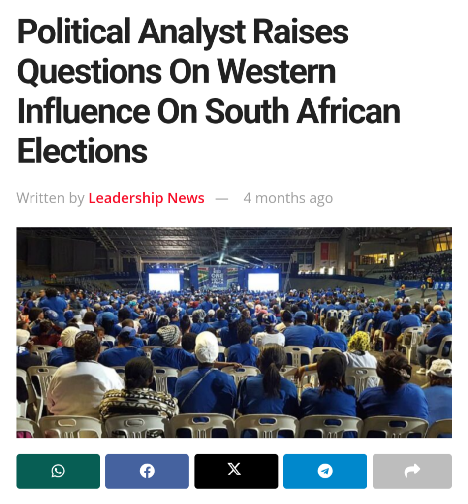 In the context of the article, the term “Western influence” would encompass these various forms of intervention and control, illustrating how they might be undermining South Africa’s electoral integrity and democratic processes.